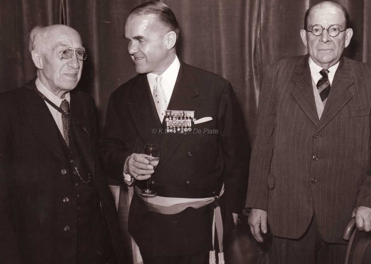 Middaguur. De receptie. Burgemeester Adolf Van Glabbeke in het gezelschap van fotograaf Maurice Antony (links).