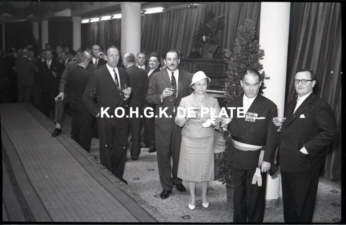 Negatief : 6 x 9 cm. - Middaguur. Receptie voor de stadsnotabelen, de klanten en de leveranciers van de firma. Rechts, Jacques Bonnevie, afgevaardigde-beheerder, en naast hem burgemeester Adolf Van Glabbeke en zijn echtgenote.