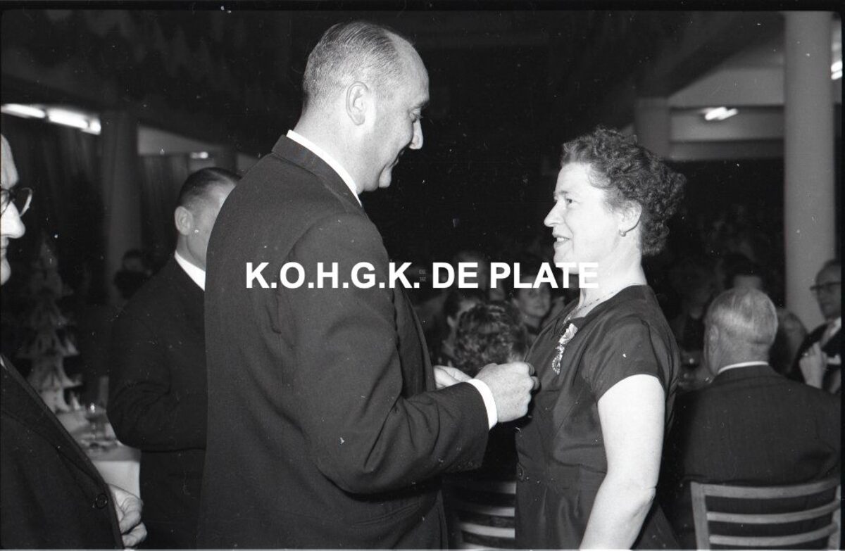 Negatief : 6 x 9 cm. - Een personeelslid krijgt een ereteken.