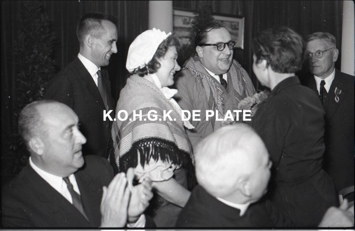 Negatief : 6 x 9 cm. - De folkloregroep "De Vismijnvrienden" zorgde voor de ambiance. De echtgenote van wijlen Pierre Valcke kreeg namens de vereniging een ruiker bloemen aangeboden. Pierre Valcke (1894-1940) was oud-voorzitter van "De Vismijnvrienden".