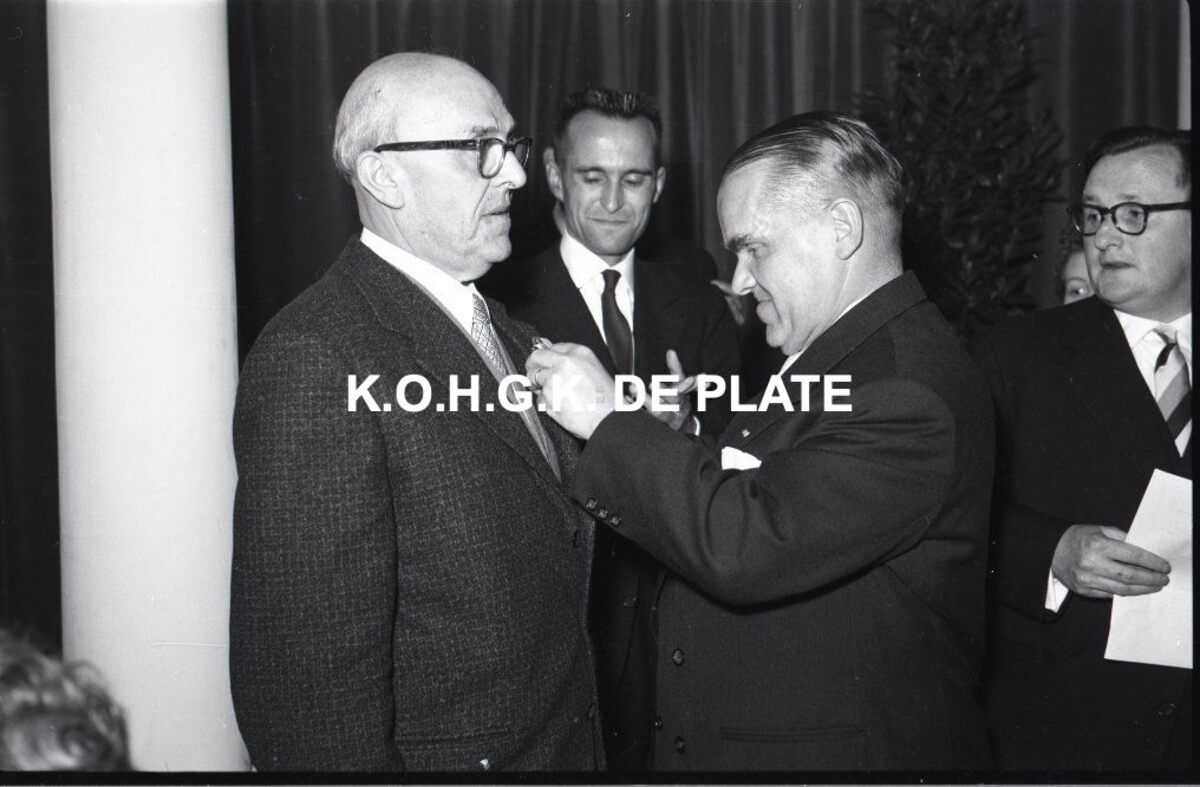 Negatief : 6 x 9 cm. - Een personeelslid krijgt een ereteken van burgemeester Adolf Van Glabbeke. Rechts, Jacques Bonnevie, afgevaardigde-beheerder.