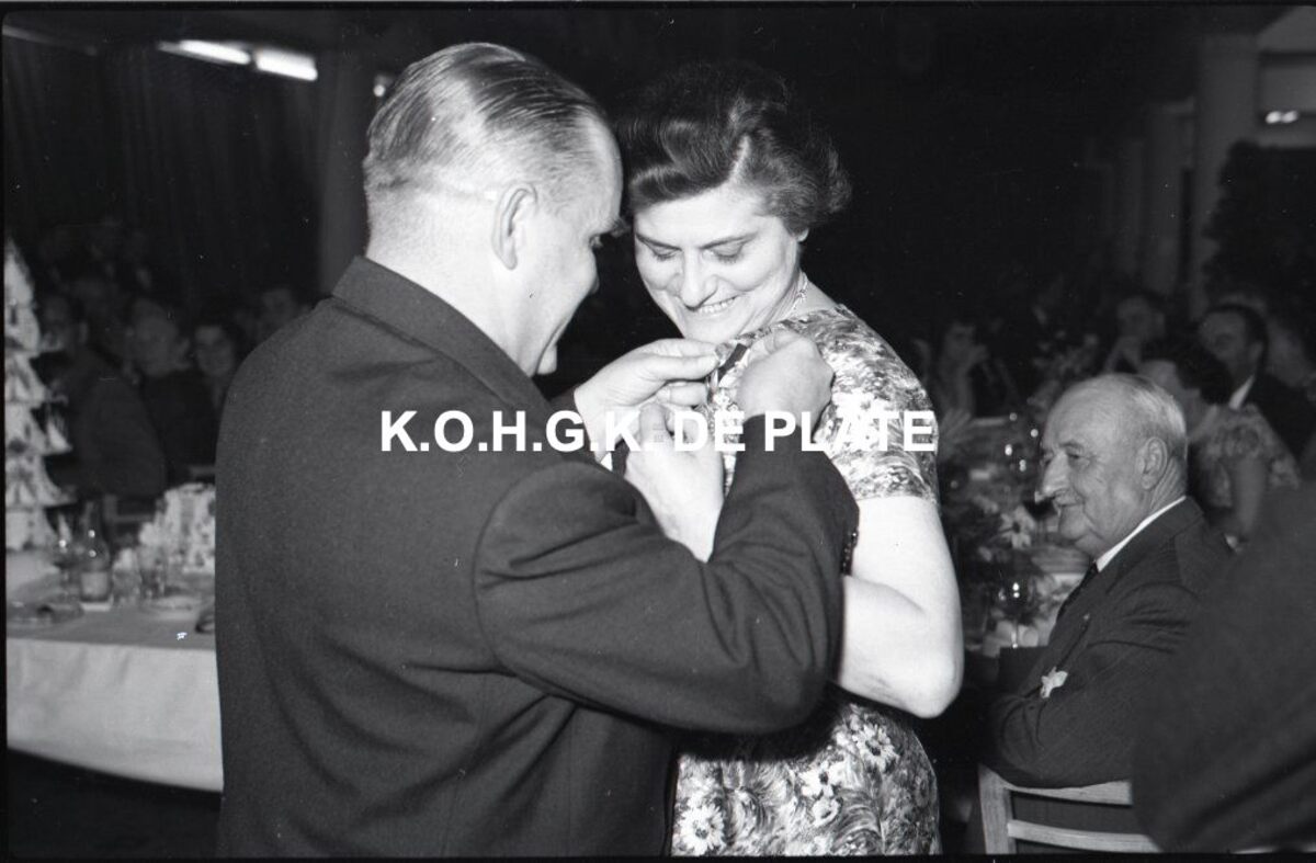 Negatief : 6 x 9 cm. - Een personeelslid krijgt een ereteken van burgemeester Adolf Van Glabbeke.