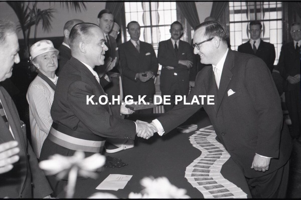 Negatief : 6 x 9 cm. - Plechtige ontvangst door het stadsbestuur van de raad van bestuur, de familie en het personeel van de firma Valcke. Burgemeester Adolf Van Glabbeke wenst de heer Jacques Bonnevie, afgevaardigde-beheerder van de firma Valcke, geluk. Hij ontving ook de ere-medaille van de stad Oostende.