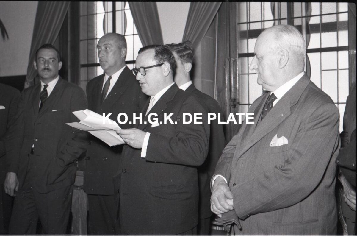 Negatief : 6 x 9 cm. - Plechtige ontvangst door het stadsbestuur van de raad van bestuur, de familie en het personeel van de firma Valcke. Het gerechtshof was toen dienstdoend stadhuis. Jacques Bonnevie, afgevaardigde beheerder, houdt zijn toespraak. Links, naast hem Paul Valcke, voorzitter van de beheerraad en rechts, Fernand Bonnevie, beheerder.