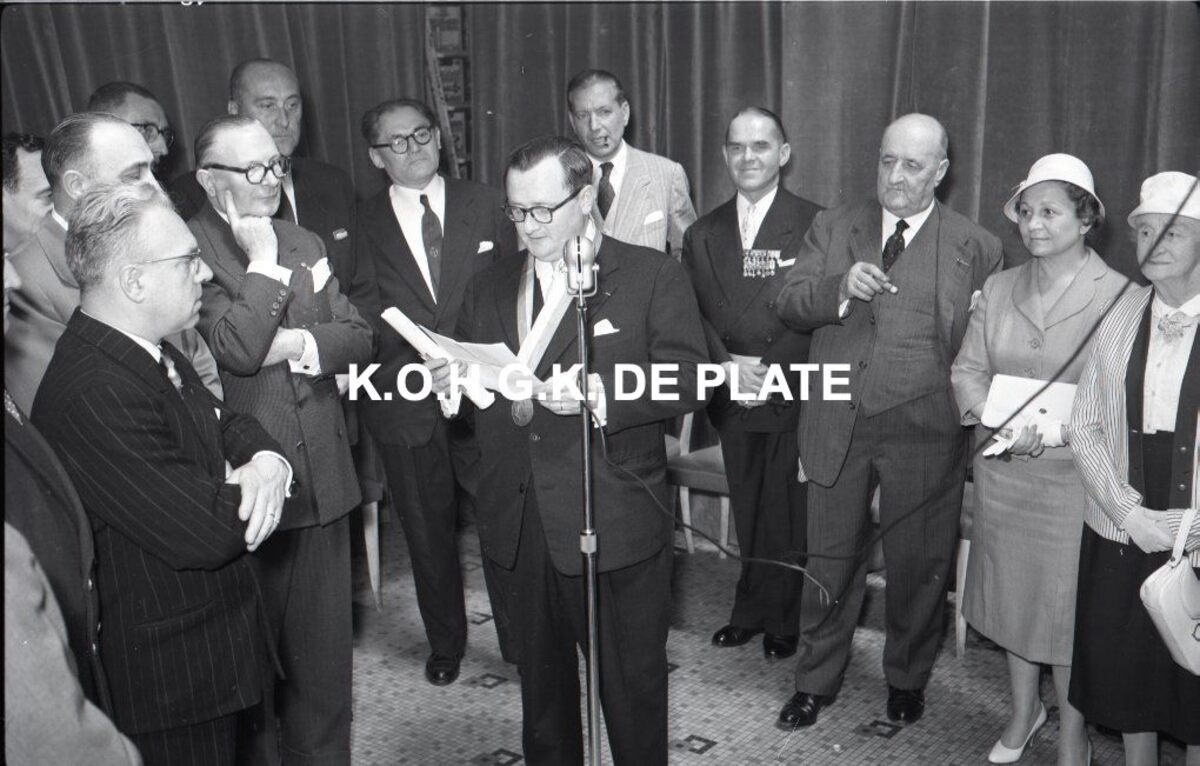 Negatief : 6 x 9 cm. - Middaguur. De receptie voor de stadsnotabelen, de klanten en de leveranciers van de firma. Jacques Bonnevie, afgevaardigde-beheerder van de firma, heeft het woord. We herkennen van rechts naar links, Bertha Tratsaert, gemeenteraadslid, mevrouw Van Glabbeke, de heer Fernand Bonnevie, beheerder en burgemeester Adolf Van Glabbeke.