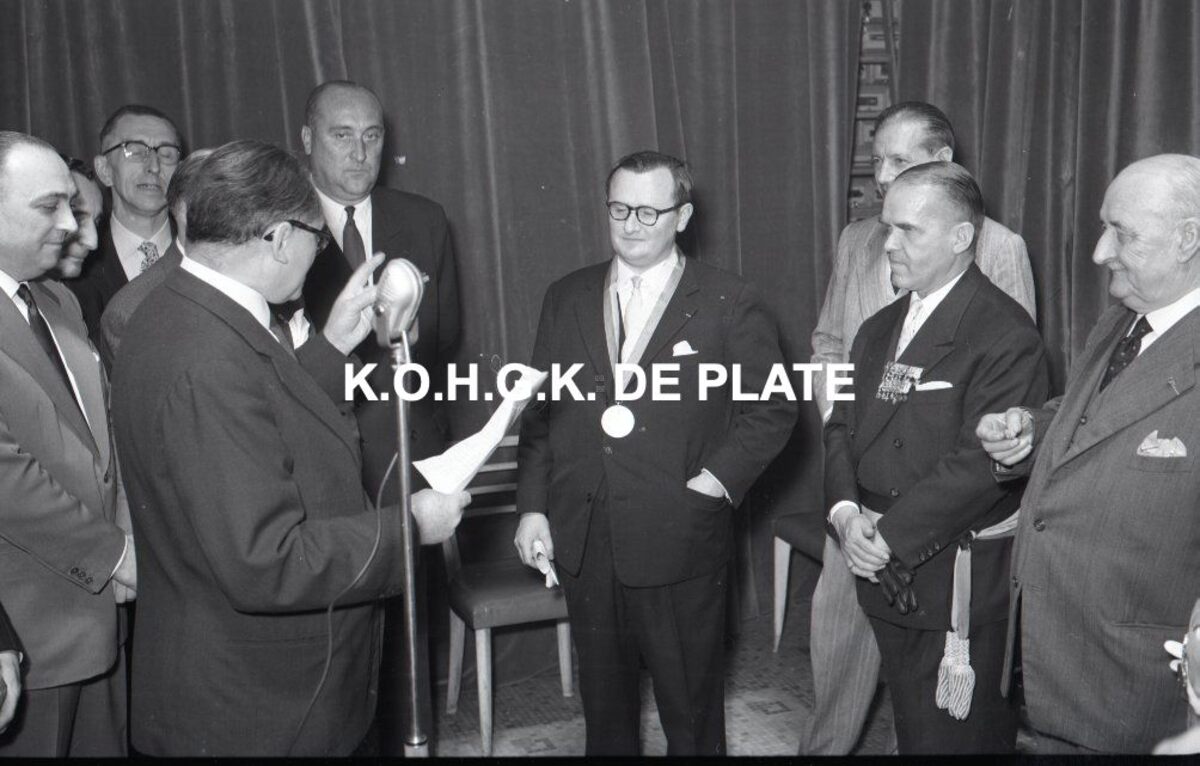 Negatief : 6 x 9 cm. - Jacques Bonnevie werd ere-burger van de Kapellestraat. Rechts, Fernand Bonnevie, beheerder en naast hem, burgemeester Adolf Van Glabbeke. Links, naast Jacques Bonnevie, Paul Valcke, voorzitter van de beheerraad. Links, Theo Dehaene.