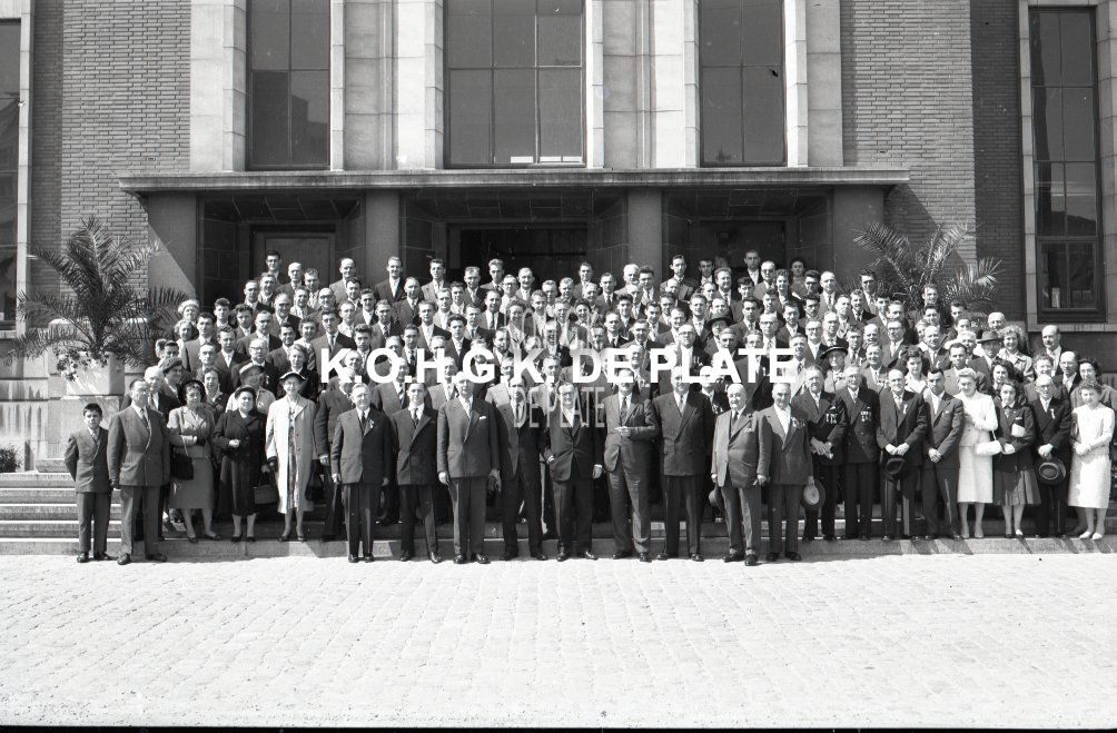 Negatief : 6 x 9 cm. - Plechtige ontvangst door het stadsbestuur van de raad van bestuur, de familie en het personeel van de firma Valcke. Het gerechtshof was toen dienstdoend stadhuis.