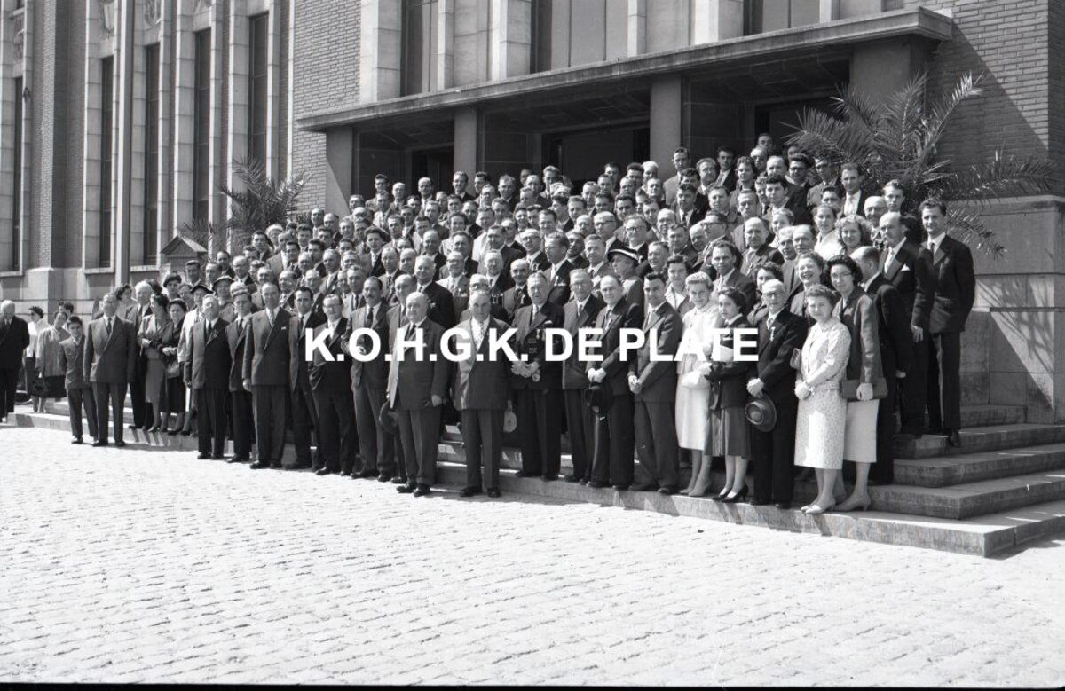 Negatief : 6 x 9 cm. - Plechtige ontvangst door het stadsbestuur van de raad van bestuur, de familie en het personeel van de firma Valcke. Het gerechtshof was toen dienstdoend stadhuis.