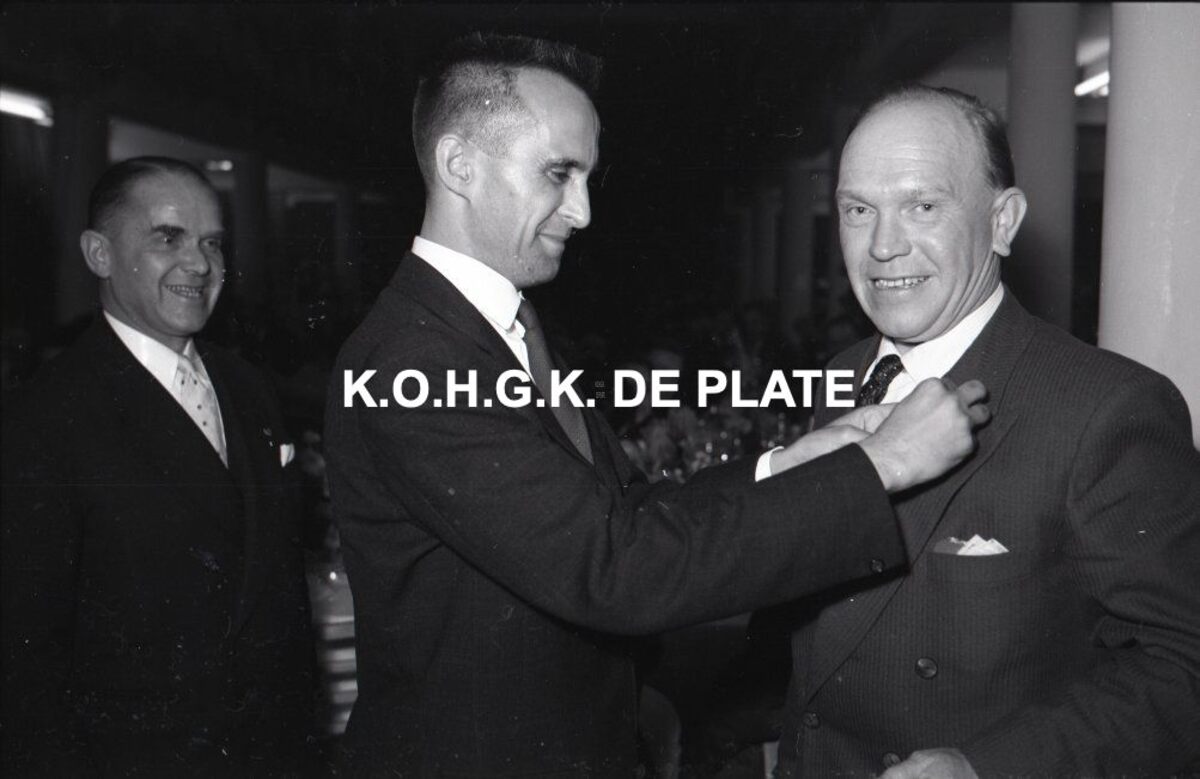 Negatief : 6 x 9 cm. - Een personeelslid krijgt een ereteken. Burgemeester Van Glabbeke kijkt blij toe.
