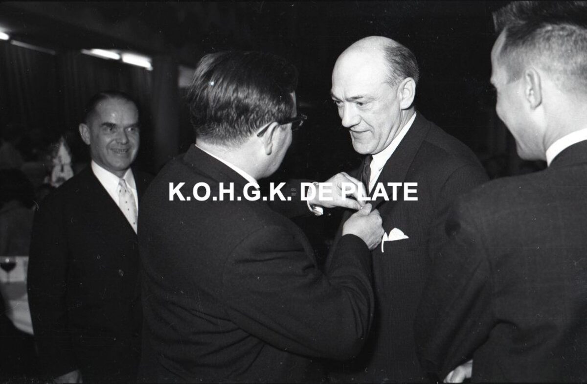 Negatief : 6 x 9 cm. - Een personeelslid krijgt een ereteken van Jacques Bonnevie, afgevaardigde-beheerder. Burgemeester Adolf Van Glabbeke kijkt blij toe.