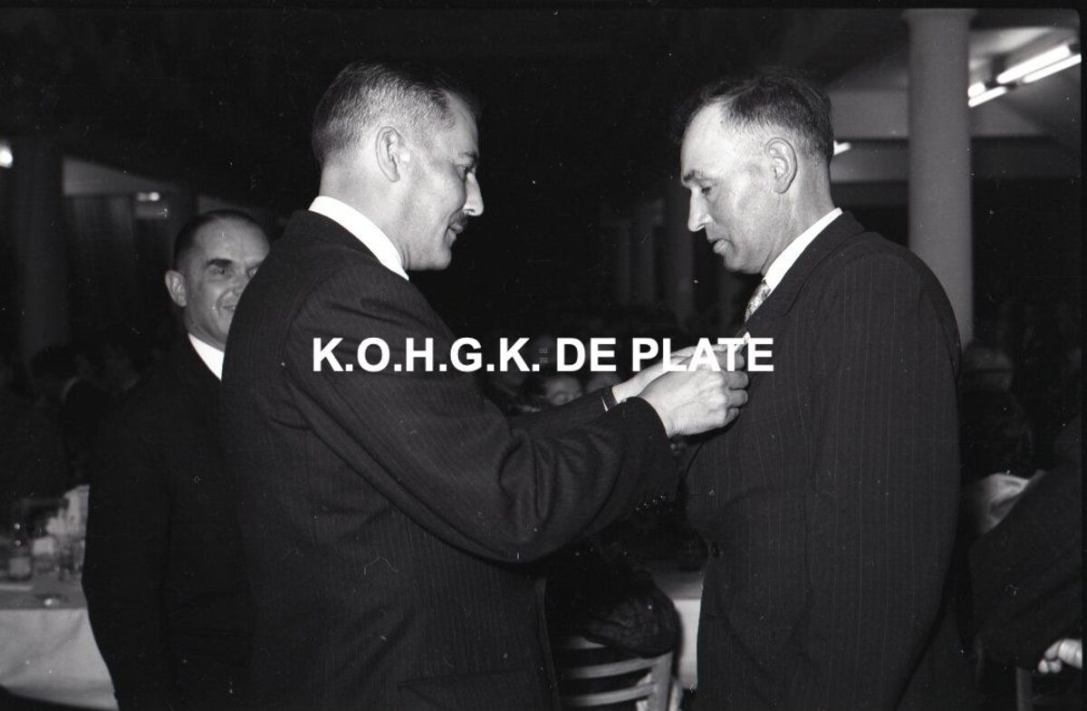Negatief : 6 x 9 cm. - Een personeelslid krijgt een ereteken. Links, burgemeester Adolf Van Glabbeke.