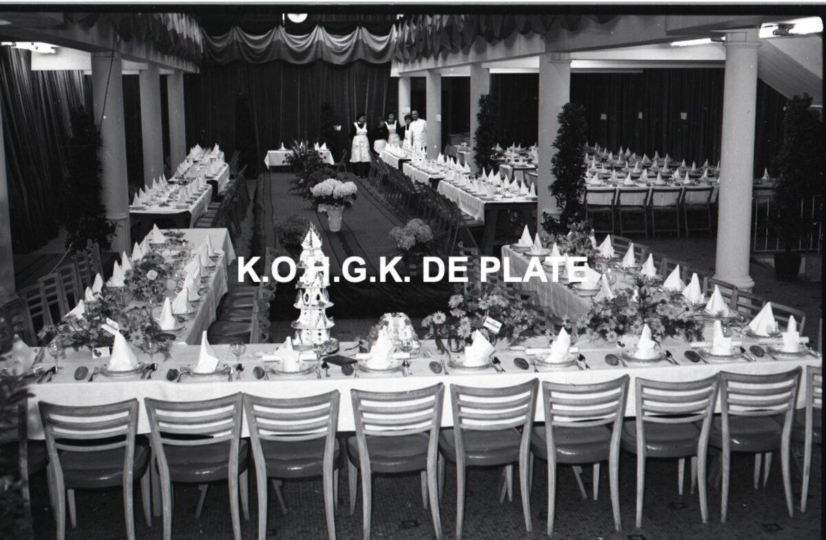 Negatief : 6 x 9 cm. - De feesttafel. Men had voor deze gelegenheid de gehele winkel leeggehaald.