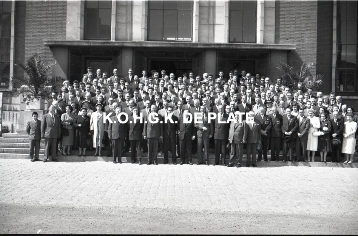 Negatief : 6 x 9 cm. - Plechtige ontvangst door het stadsbestuur van de raad van bestuur, de familie en het personeel van de firma Valcke. Het gerechtshof was toen dienstdoend stadhuis.