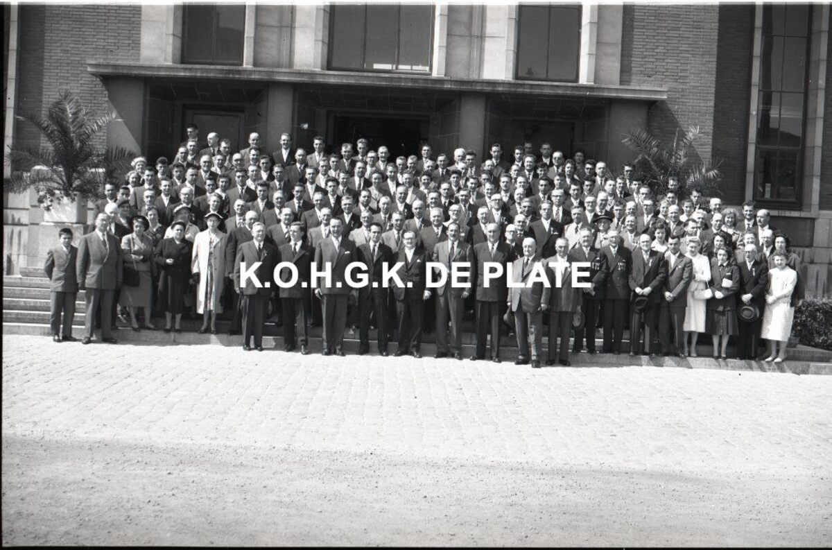 Negatief : 6 x 9 cm. - Plechtige ontvangst door het stadsbestuur van de raad van bestuur, de familie en het personeel van de firma Valcke. Het gerechtshof was toen dienstdoend stadhuis.