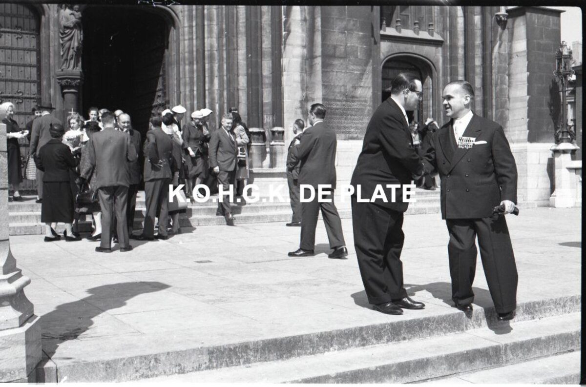 Negatief : 6 x 9 cm. - 's Morgens was er in de Sint Petrus en Pauluskerk een eucharistieviering voor de overleden familie- en personeelsleden. Na de plechtigheid, burgemeester Adolf Van Glabbeke in gesprek met Jacques Bonnevie, afgevaardigde-beheerder van de firma Valcke.