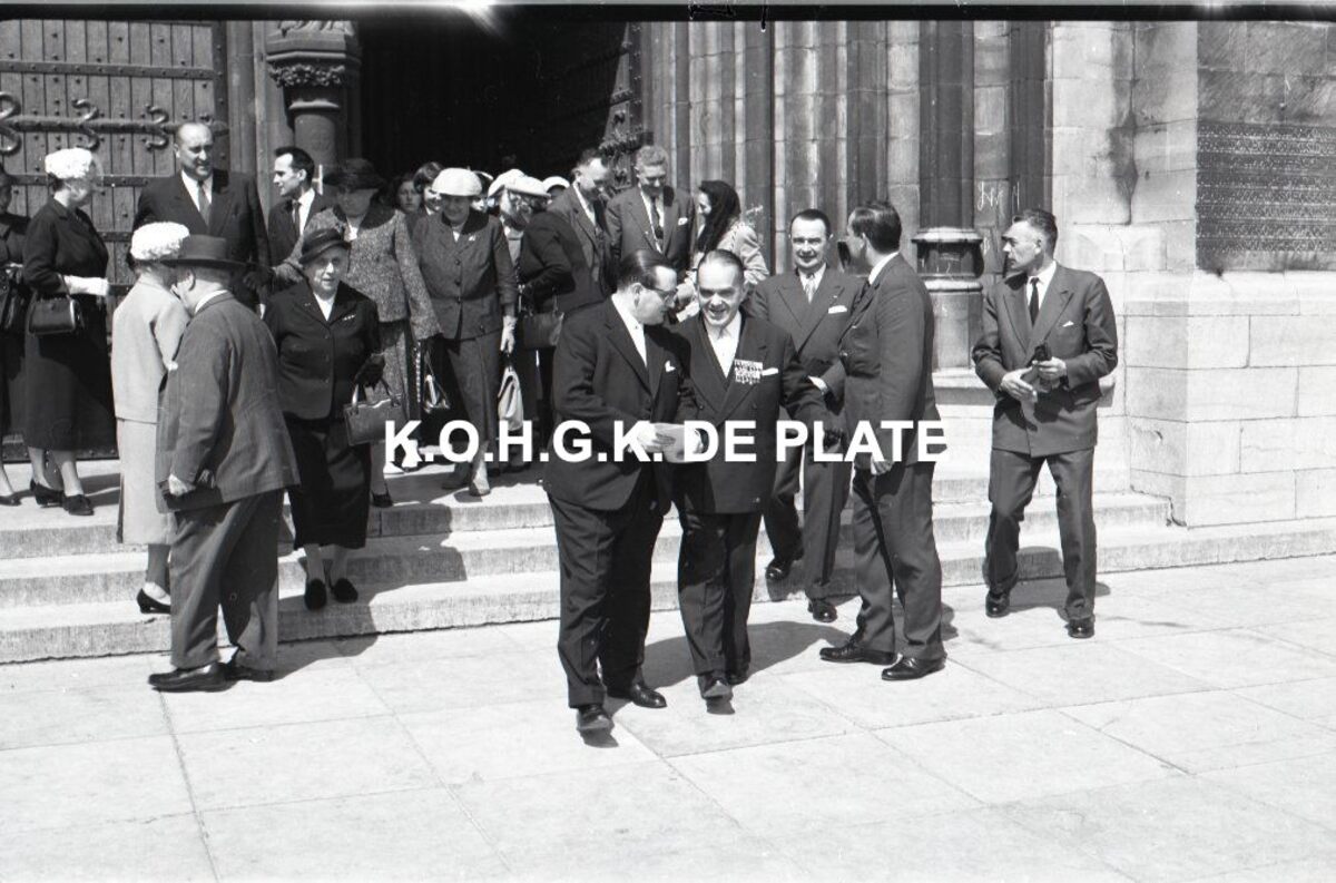Negatief : 6 x 9 cm. - 's Morgens was er in de Sint Petrus en Pauluskerk een eucharistieviering voor de overleden familie- en personeelsleden. Na de plechtigheid, burgmeester Adolf Van Glabbeke in gesprek met Jacques Bonnevie, afgevaardigde-beheerder van de firma Valcke