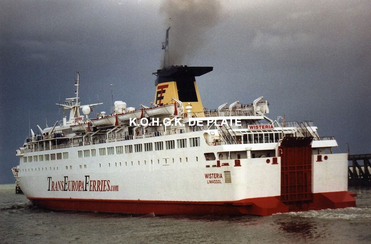 Formaat : 10 x 15 cm. Carferry "Wisteria" in de kleuren van Trans Europa Ferries