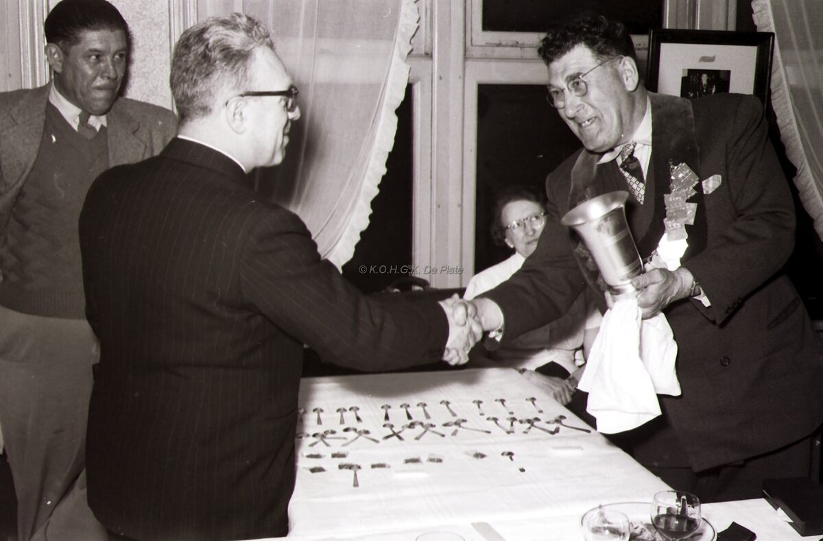 Voorzitter Luc VERMEULEN overhandigt een beker aan sire Richard PANESI op het banket van "Les Carabiniers"