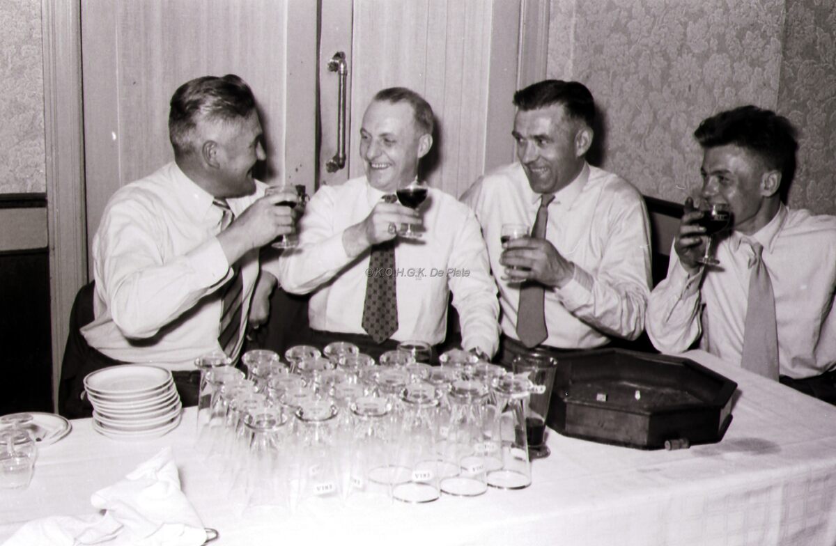 Vier vrolijke vrienden heffen het glas op het banket van schuttersvereniging "Les Carabiniers" na een match op de "pitjesbak".