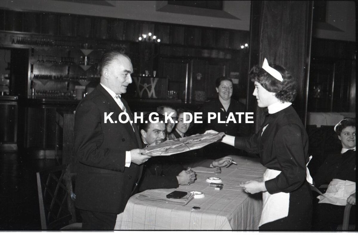 Foto : Opdiensters ontvangen hun diploma na het volgen van een herscholingscursus. Hotel Wellington. 15/01/1958
