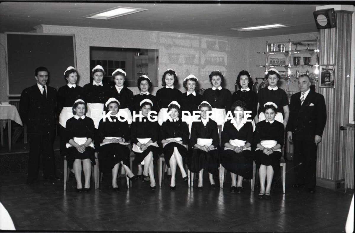 Foto : Opdiensters ontvangen hun diploma na het volgen van een herscholingscursus. Hotel Wellington. 15/01/1958