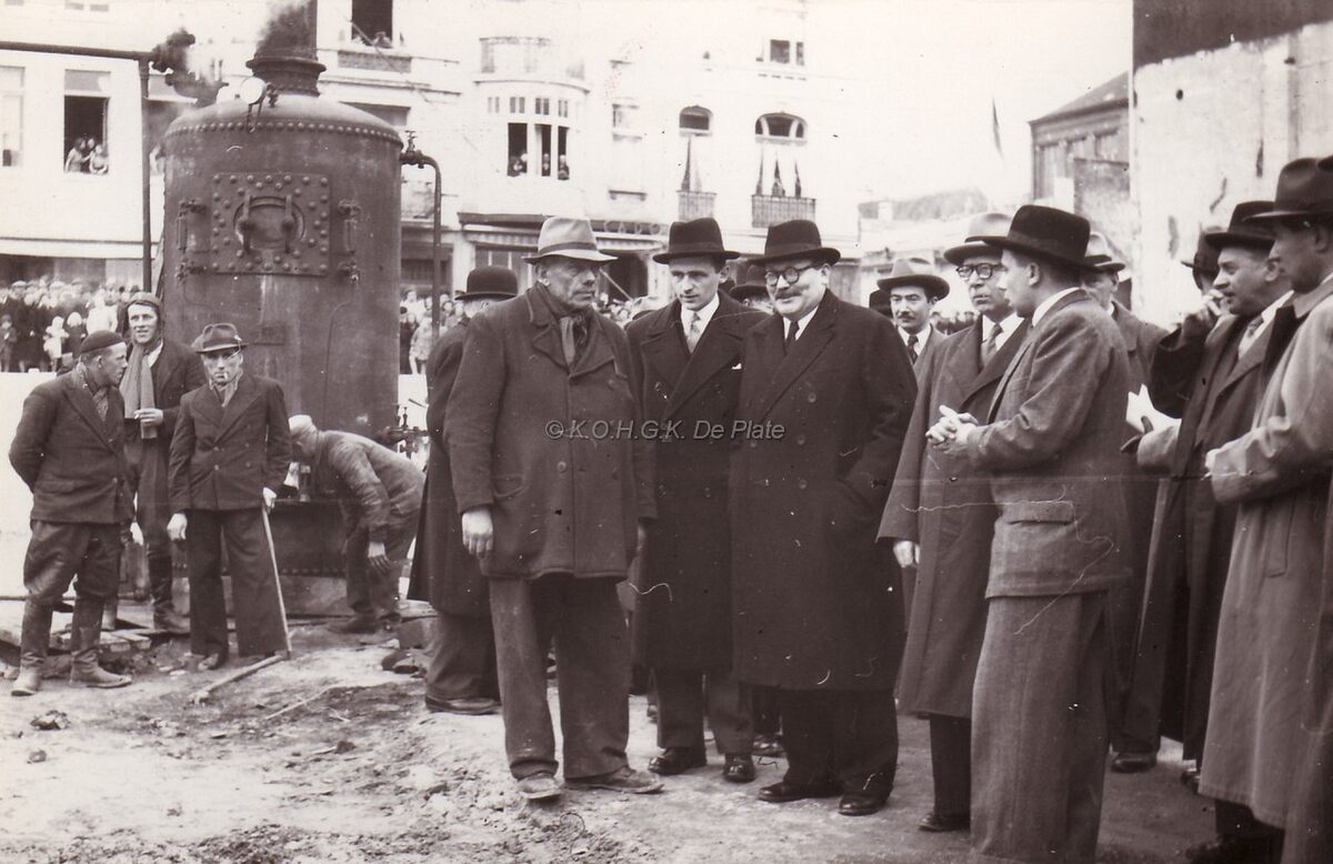 Eerste paal geheid van het nieuwe postgebouw. Op de werf, centraal minister Achiel Van Acker, links van hem provinciegoeverneur Pierre Van Outryve d'ydewalle. Rechts, Hendrik Serrruys, burgemeester en achter hem een jonge schepen Roger De Kinder de latere provinciegoeverneur van Oost Vlaanderen. De funderingswerken werden uitgevoerd door de firma Soetaert (Oostende). In totaal zouden 229 betonnen pijlers worden geheid.