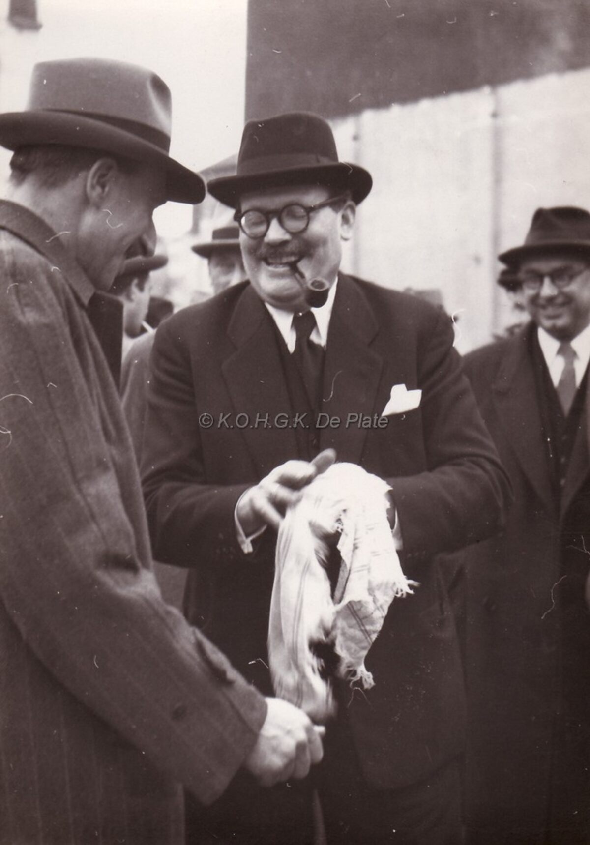 Minister Achiel Van Aacker reinigt de handen na bezoek aan de bouwwerf van net nieuwe postgebouw waar de eerste paal werd geheid.