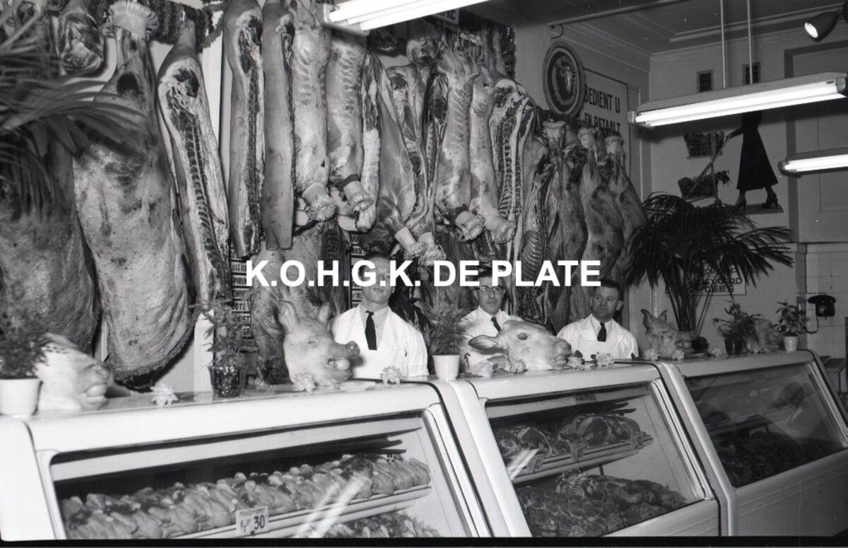 Negatief : 6 x 9 cm. - De toonbank van de slagerijafdeling tijdens de paastijd. Als afsluiting van de vastentijd en als voorbereiding op pasen versierden de slagers in de periode van Witte donderdag en Goede vrijdag hun etalages en toonbanken.