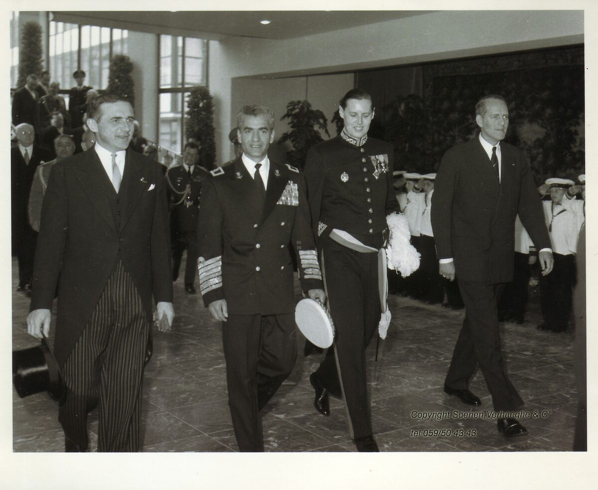 Formaat : 14 x 11 cm. - Plechtige ontvangst op het stadhuis. De sjah in aanwezigheid van de provinciegouverneur van West-Vlaanderen Pierre van Outryve d'Ydewalle (links) en burgemeester Jan Piers. De Ibis jongens zorgen voor de erehaag