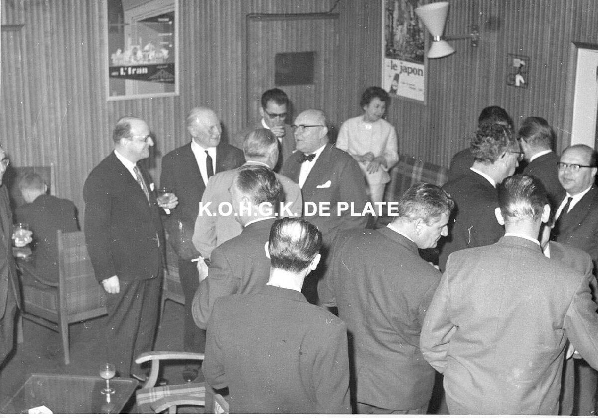 2 exemplaren, formaat : 13 x 18 cm. - Links, met het glas in de hand, premier Théo Lefèvre en in het midden, met vlinderdas, vicepremier Paul-Henri Spaak.