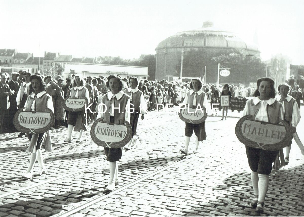 Vergroting. - Formaat : 30 x 42 cm. - Grootse stoet : "De muziek door de eeuwen heen". Viering eeuwfeest van het Stedelijk Conservatorium. De stoet op de Vindictivelaan. Op de achtergrond het gebouw van het "Panorama van den Ijzer". Links, het ESSO benzinestation, genaamd "Panorama". Ingehuldigd op 09/10/1948