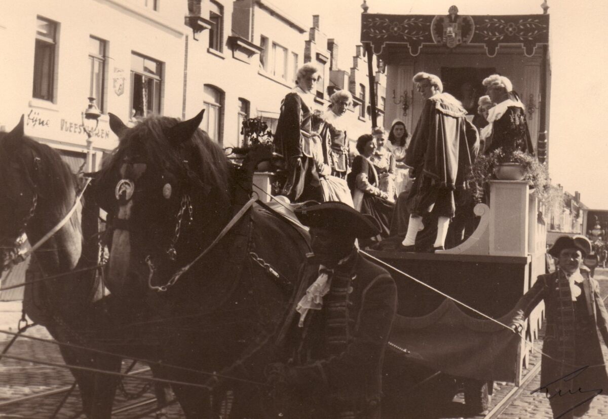 Grootse geschiedenis stoet : "De muziek door de eeuwen heen". Een praalwagen, getrokken door paarden, in de stoet ter viering van het 100 jarig bestaan van het Stedelijk Conservatorium.