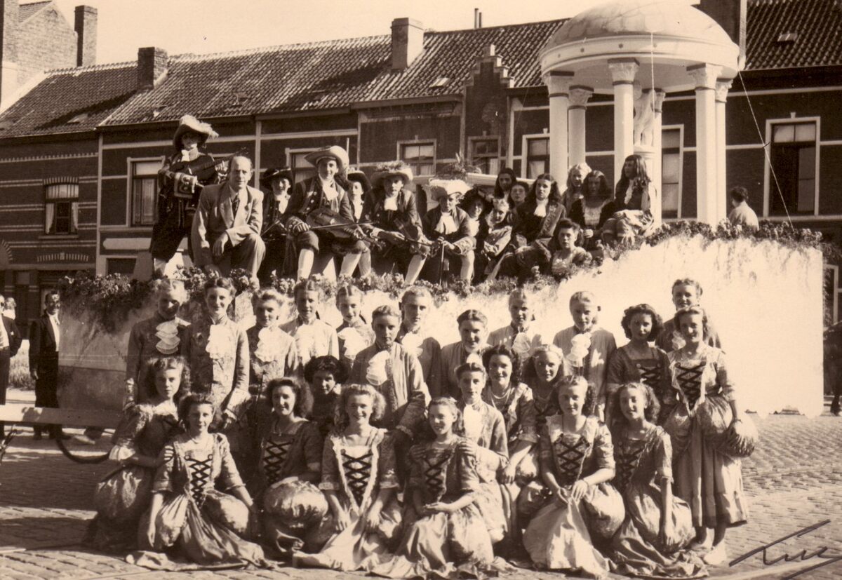 Grootse geschiedenis stoet : "De muziek door de eeuwen heen". Een groep deelnemers in de stoet ter viering van het 100 jarig bestaan van het Stedelijk Conservatorium op de Torhoutsesteenweg.