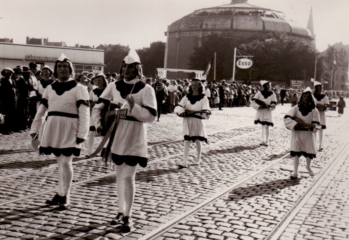 Grootse geschiedenis stoet : "De muziek door de eeuwen heen. Minnestrelen in de stoet ter viering van het eeuwfeest van het Stedelijk Conservatorium op de Vindictivelaan. Op de achtergrond het gebouw van het "Panorama van den Ijzer". Links, het benzinestation van ESSO genaamd "Panorama" en ingehuldigd op 09/10/1948