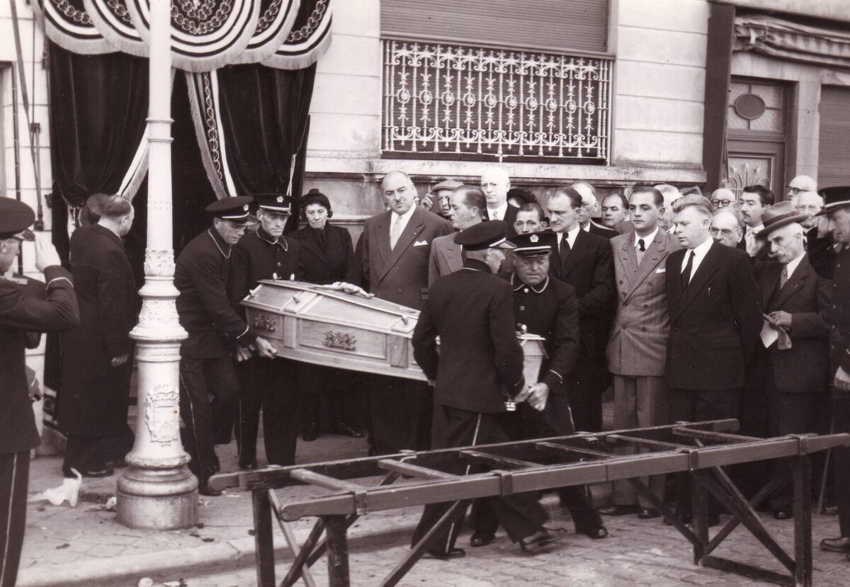 Formaat : 13 x 18 cm. - Begrafenis van Arthur Vanhoutte, Mariakerks politiek figuur, gemeenteraadslid voor de liberalen. De lijkkist vertrekt uit het sterfhuis, achter de lijkkist staat schepen Maurice Quaghebeur. Links van de lantaarnpaal begrafenisondernemer Gaston Bourgoignie. Het rouwbaldakijn werd verzorgd door de firma David.
