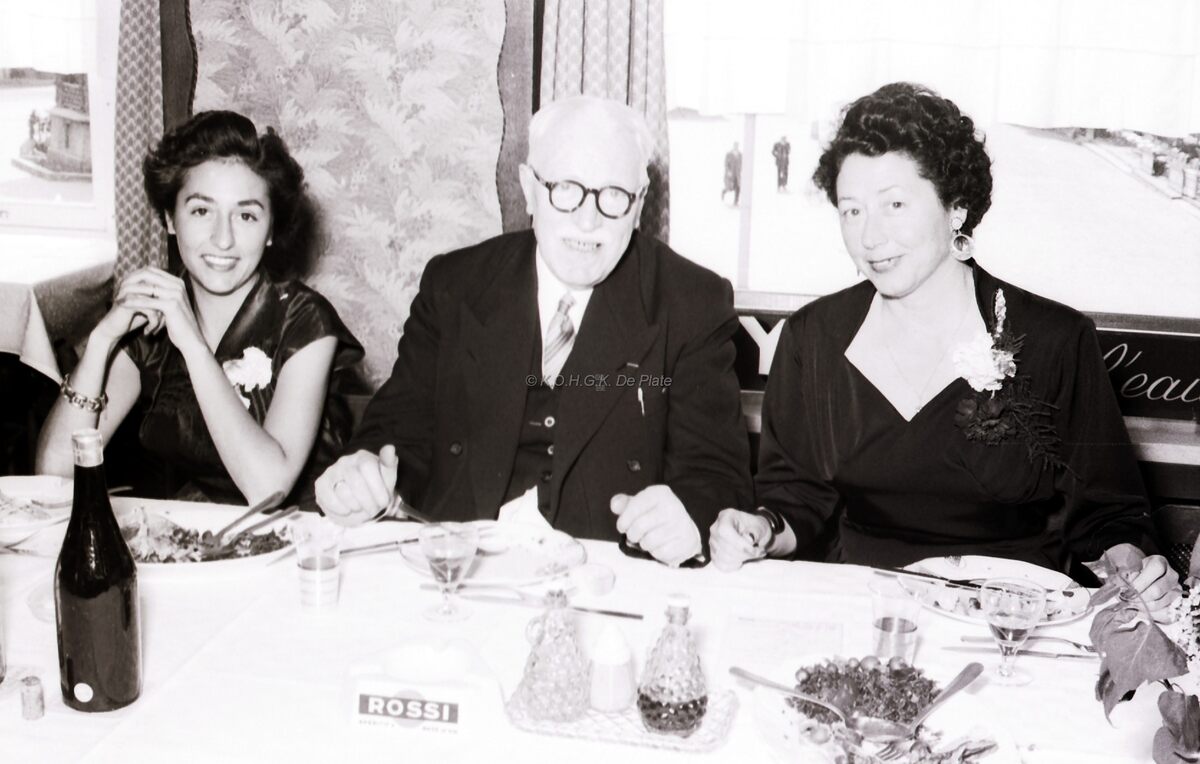 De voorzitter van de kappersvereniging en twee aanminnige kapsters (?) op het jaarlijks banket.