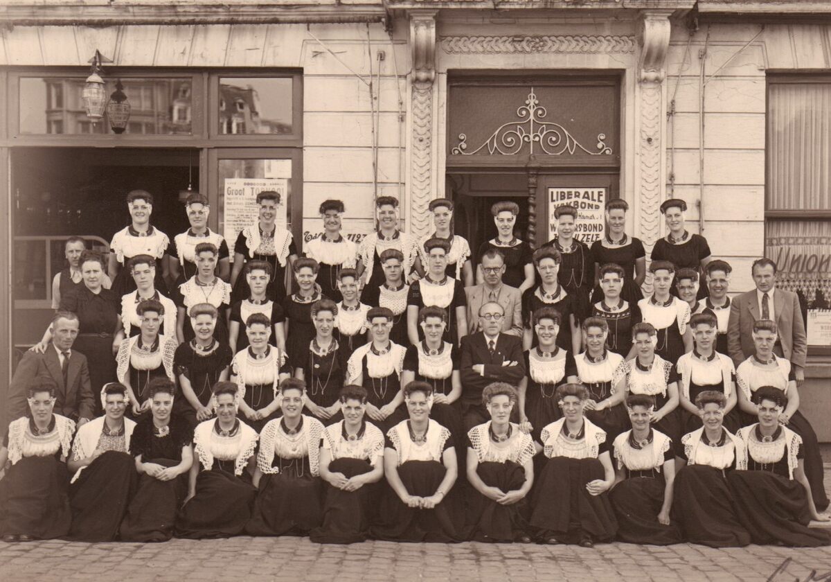 Een prachtige foto van een groep Nederlandse vrouwen in hun traditionele klederdracht poseren voor het lokaal van de Liberale Vakbond op het Wapenplein.