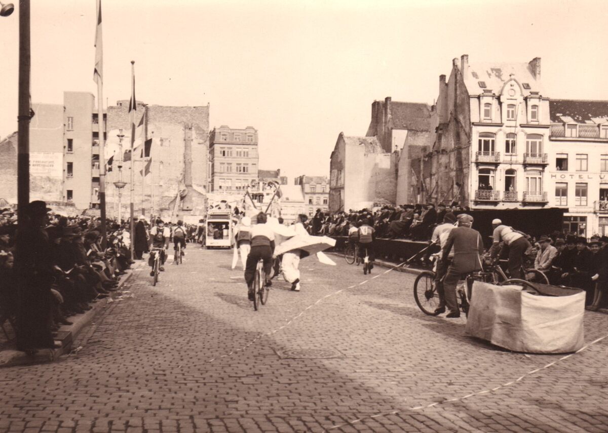 Een groep wielrijders van "Ostend Stadion" op het Wapenplein tijdens de Carnavalstoet. Rechts de Kerkstraat. Let op de vernielingen, nog altijd zichtbaar, door de Duitse bombardementen in het begin van de Tweede Wereldoorlog.