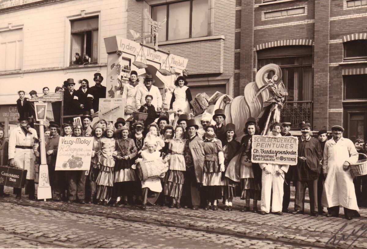 De praalwagenwagen nr.10 "In den Vrijen Handel" van de "Handelaarsbond Torhoutsesteenweg" uit de carnavalstoet op de Torhoutsesteenweg aan de hoek met de Hennepstraat, met links Cafe "Vrij Oostende". Borden met de opschriften : "Schilderwerken. Peintures. Ch. Vanduyvenboden. Nijverheidstraat, Rue de l'Industrie 45. Oostende" en "Velos-Motos. R. Degryse en zoon. Torhoutsche Steenweg 100"