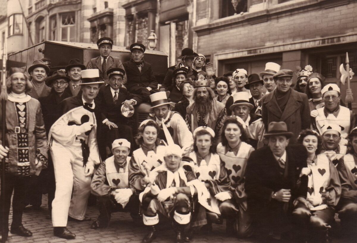 Deelnemers van verschillende groeperingen uit de Carnavalstoet poseren op de Torhoutsesteenweg. We herkennen deelnemers uit de groep "Het Kaartspel"