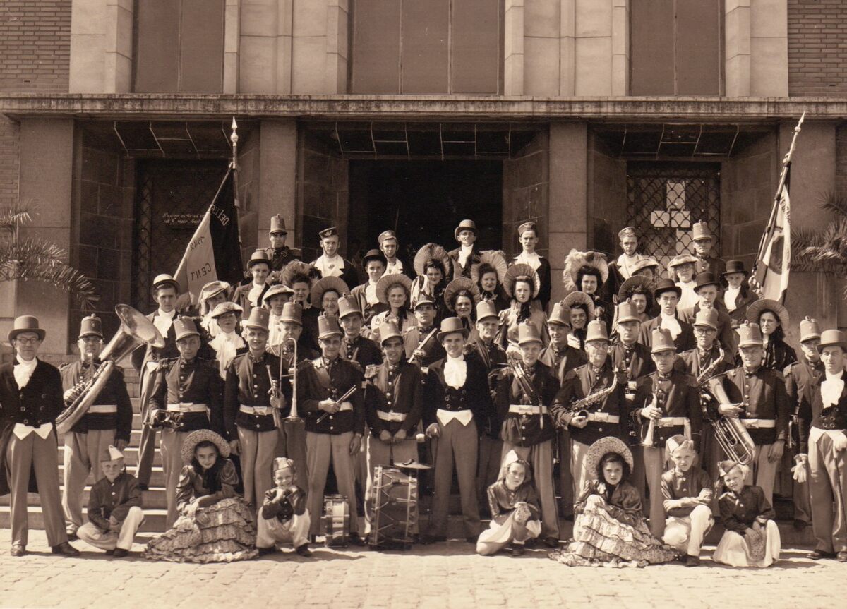 Een muziekgroep uit Gent (?), met vaandels, uit de carnavalstoet op de trap van het dd. stadhuis (huidig gerechtshof) aan het Canadaplein. De grote halfvastenstoet van 16 maart 1947 bestond uit 40 groepen, 15 praalwagens en 6 muziekgroepen.