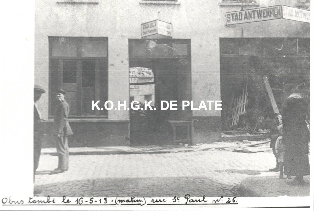 Formaat : 8,5 x 12,5 cm. - Obus tombé le 16-5-18 (matin) rue St. Paul n°25. - De herberg Stad Antwerpen gelegen Sint-Paulusstraat 25, werd getroffen door een obus in de ochtend van 16 mei. Niemand werd gewond.