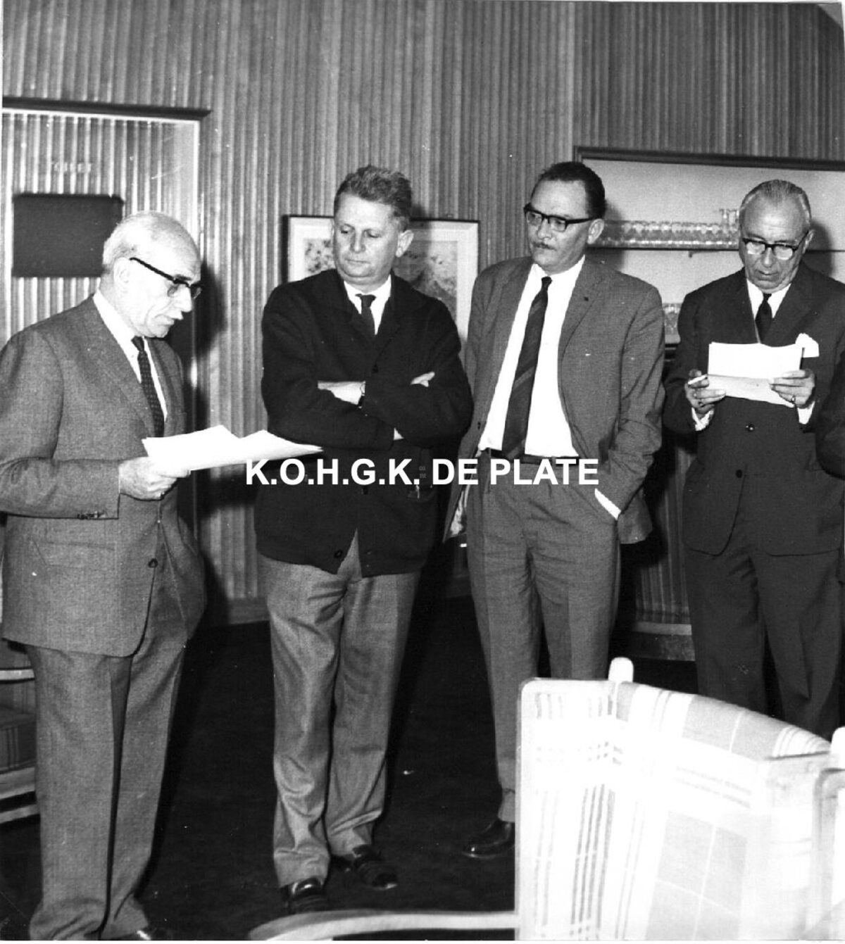 Formaat : 18 x 16 cm. - De vernissage. De heer Servais, president van de tentoonstelling, houdt zijn toespraak. Naast hem, Jan Guillemin, journalist, Frank Edebau, conservator van het Museum voor Schone Kunsten en de heer Dumont, persadviseur van het Gemeentekrediet van België.