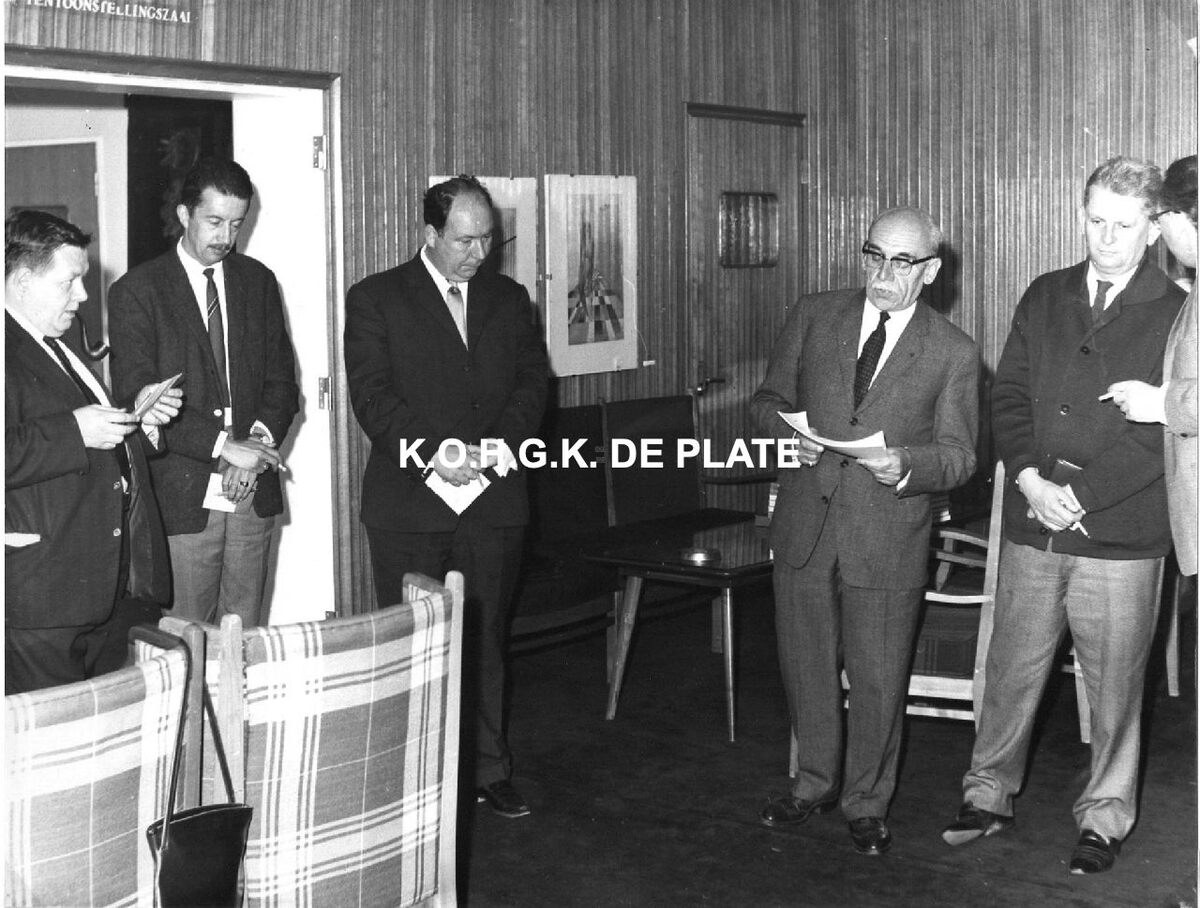 Formaat : 18 x 24 cm. - De vernissage. De heer Servais, president van de tentoonstelling houdt zijn toespraak. Rechts, Frank Edebau, conservator van het Museum voor Schone Kunsten en Jan Guillemin, journalist. Links, de journalisten : Michel Bailly, Herman Moerman en John Hermans.