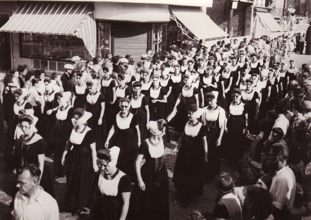 Een groep Nederlandse vrouwen in klederdracht in de Kapellestraat.