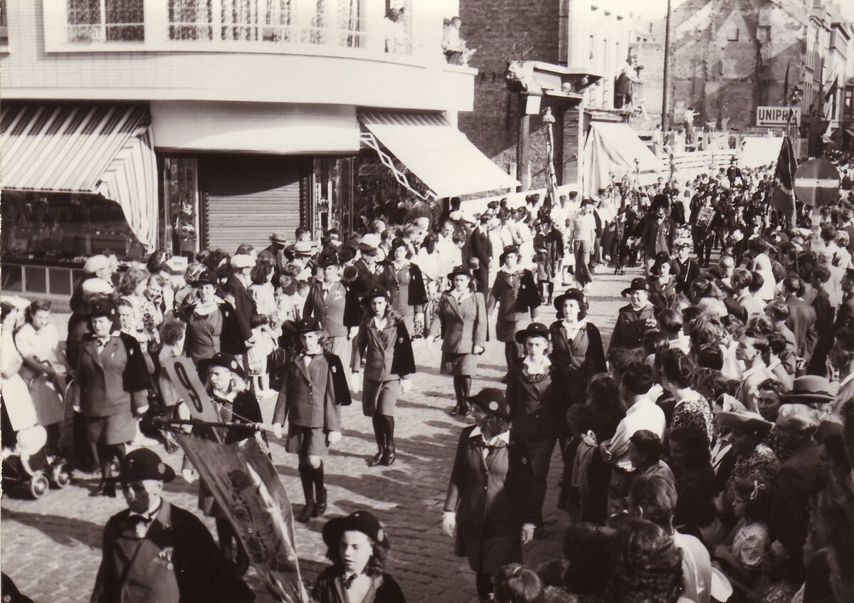De folkloristische groep "De Lustige Zigomars" in de Kapellestraat, hoek Ooststraat. De vlagtoppen van de vlaggen die hier worden meegedragen, een vrouwelijke en mannelijke houtsculptuur zijn aanwezig in onze heemkring. Zie indexnummers 2014/4488 en 2014/4489