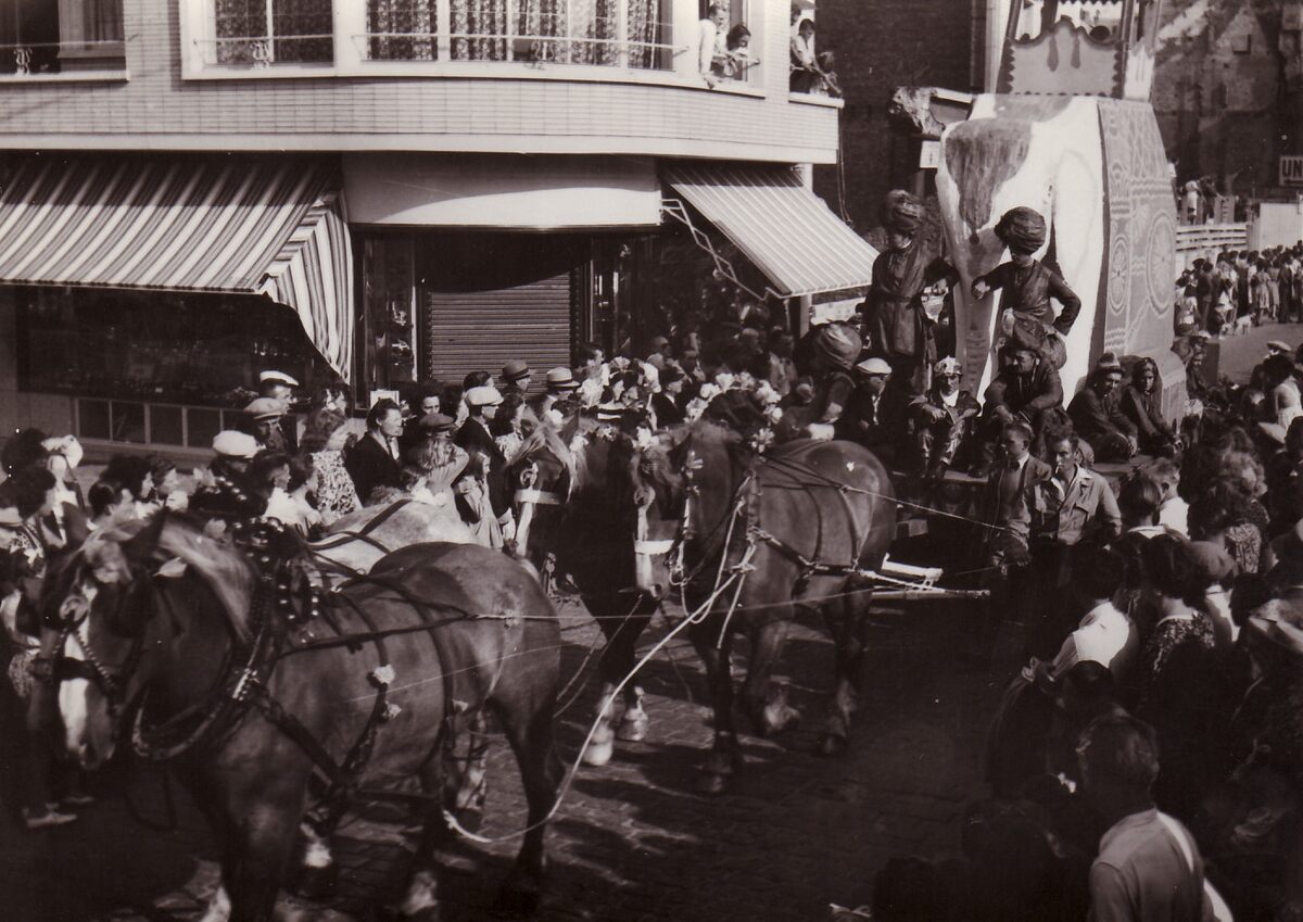 Een praalwagen getrokken door vier paarden in de Kapellestraat.