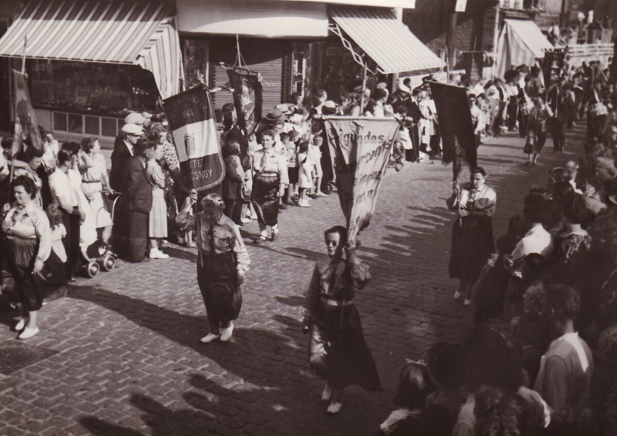 Een folkloregroep uit Roubaix, met vaandels in de Kapellestraat.