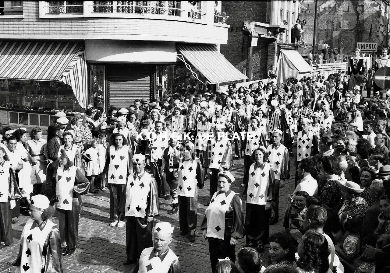 Negatief : 4 x 6,5 cm. - De groep "Het Kaartspel" in de Kapellestraat, hoek Ooststraat.