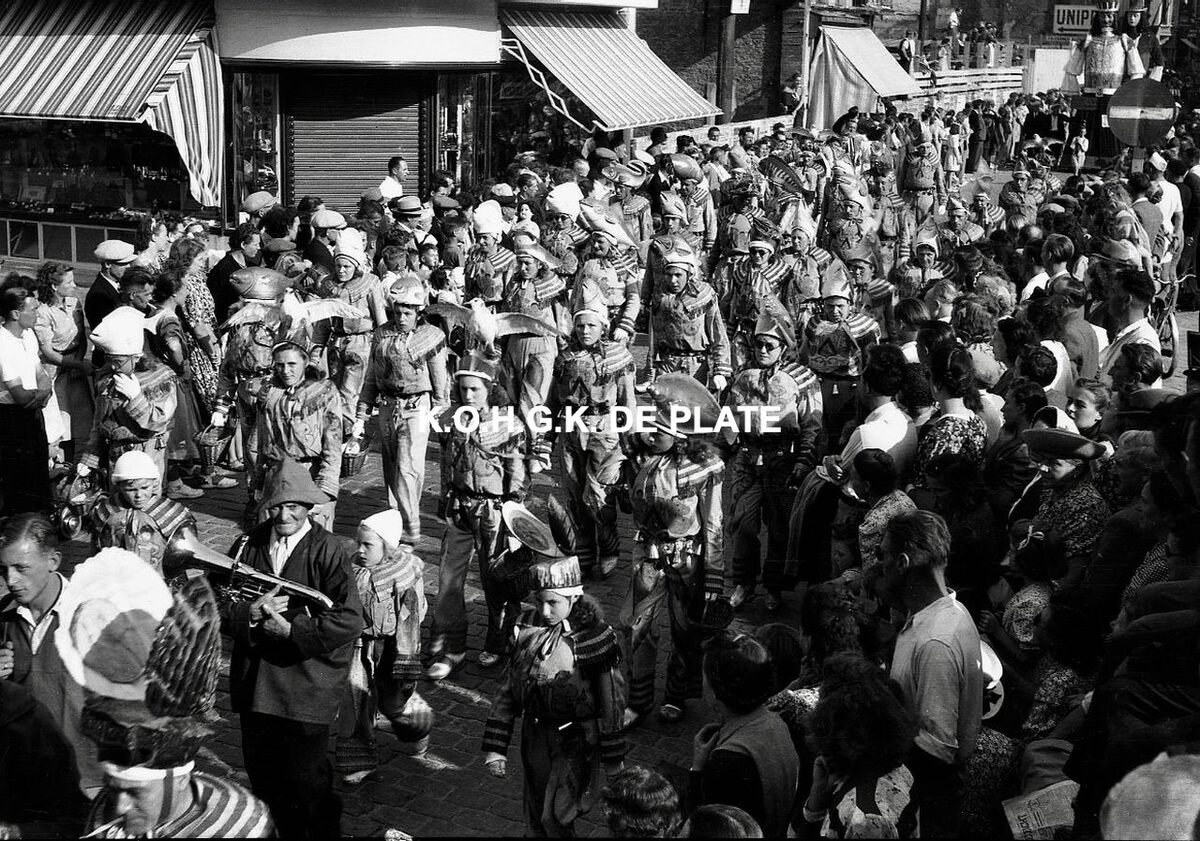 Negatief : 4 x 6,5 cm. - De Oostendse groep "Gilles der Zee" ind e Kapellestraat, hoek Ooststraat